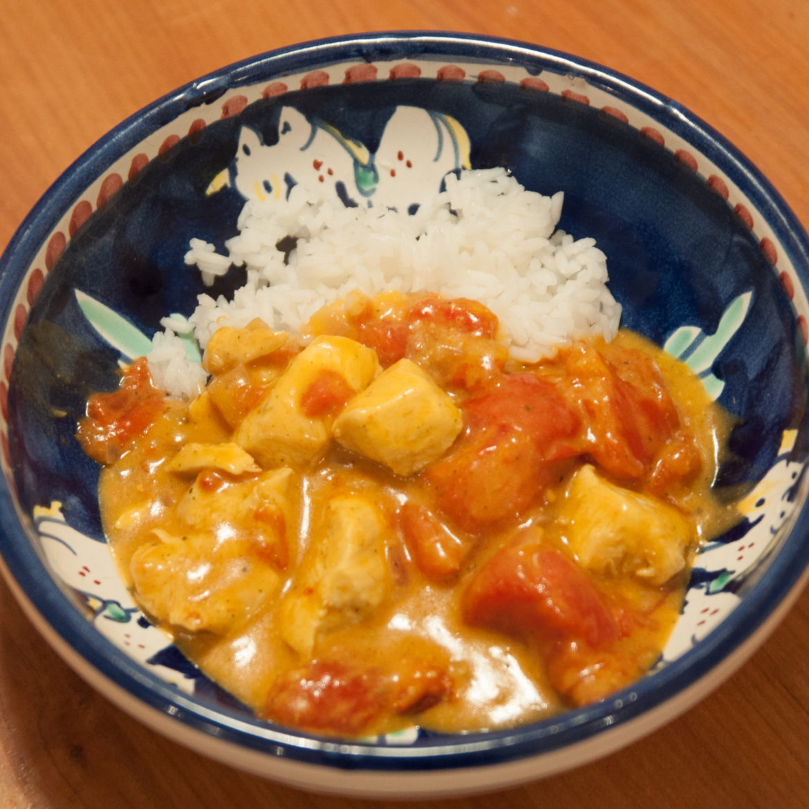 - Serve with rice. Boil 300g Basmati rice with 5dl water and 1 teaspoon of salt. Cover and let it simmer for 15 minutes.