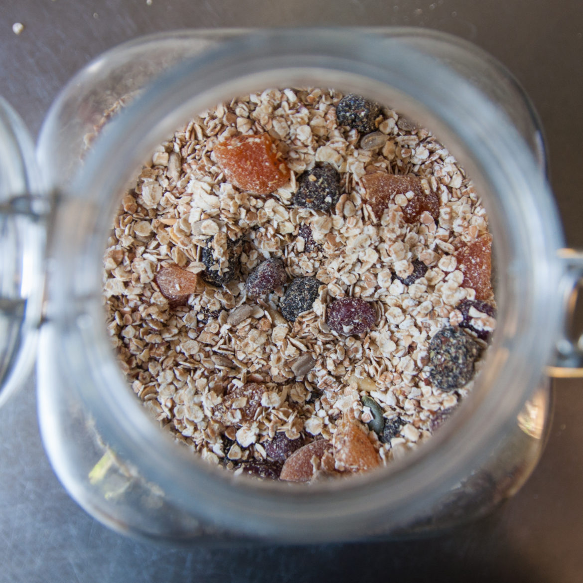 Since we have detected that commercial Muesli mixtures contain (at least) 20% sugar we mix it ourselves. This is a basic recipe which can be modified to suit your personal taste.