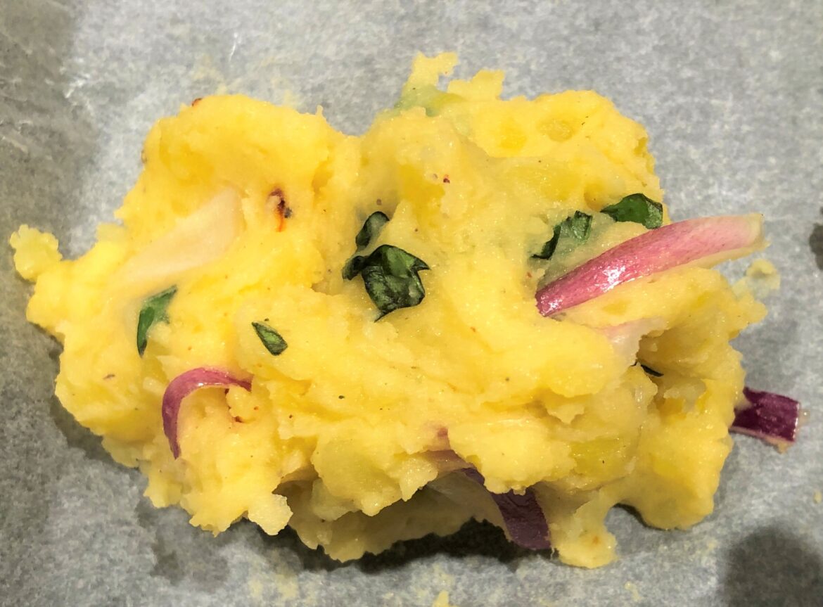 When the potatoes are lukewarm, mash them by hand and mix them in a bowl with the onions, herbs, egg and spices.