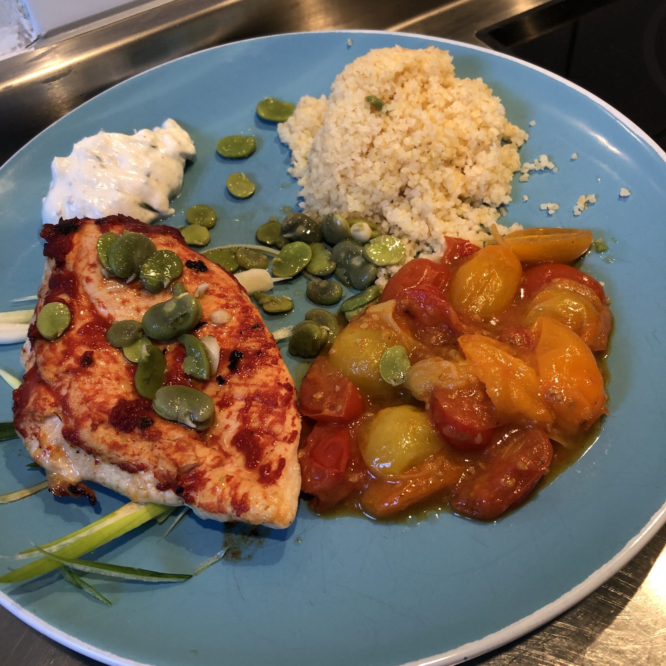 Delicious combination of fava beans, the tomatoes and a chicken breast
