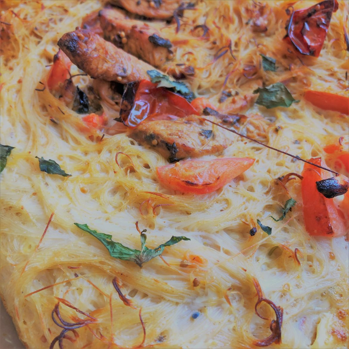 - Sauté the quartered date tomatoes and the finely chopped poultry (turkey or chicken) and a handful of cashew nuts in it. Season with cayenne pepper, garam massala, plenty of Thai basil, turmeric, fresh coriander, the juice of a whole lemon and a little salt. Boil the vermicelli pasta in salted water until soft. Drain and pour into a gratin dish together with the meat.