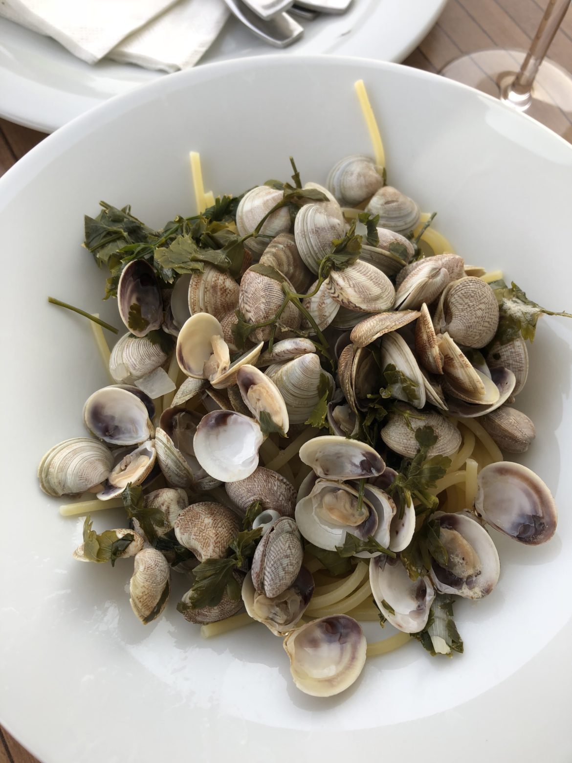 - 9. In parallel cook the spaghetti al dente in salted water 10. Put the Spaghetti on a plate and add the clams on top.